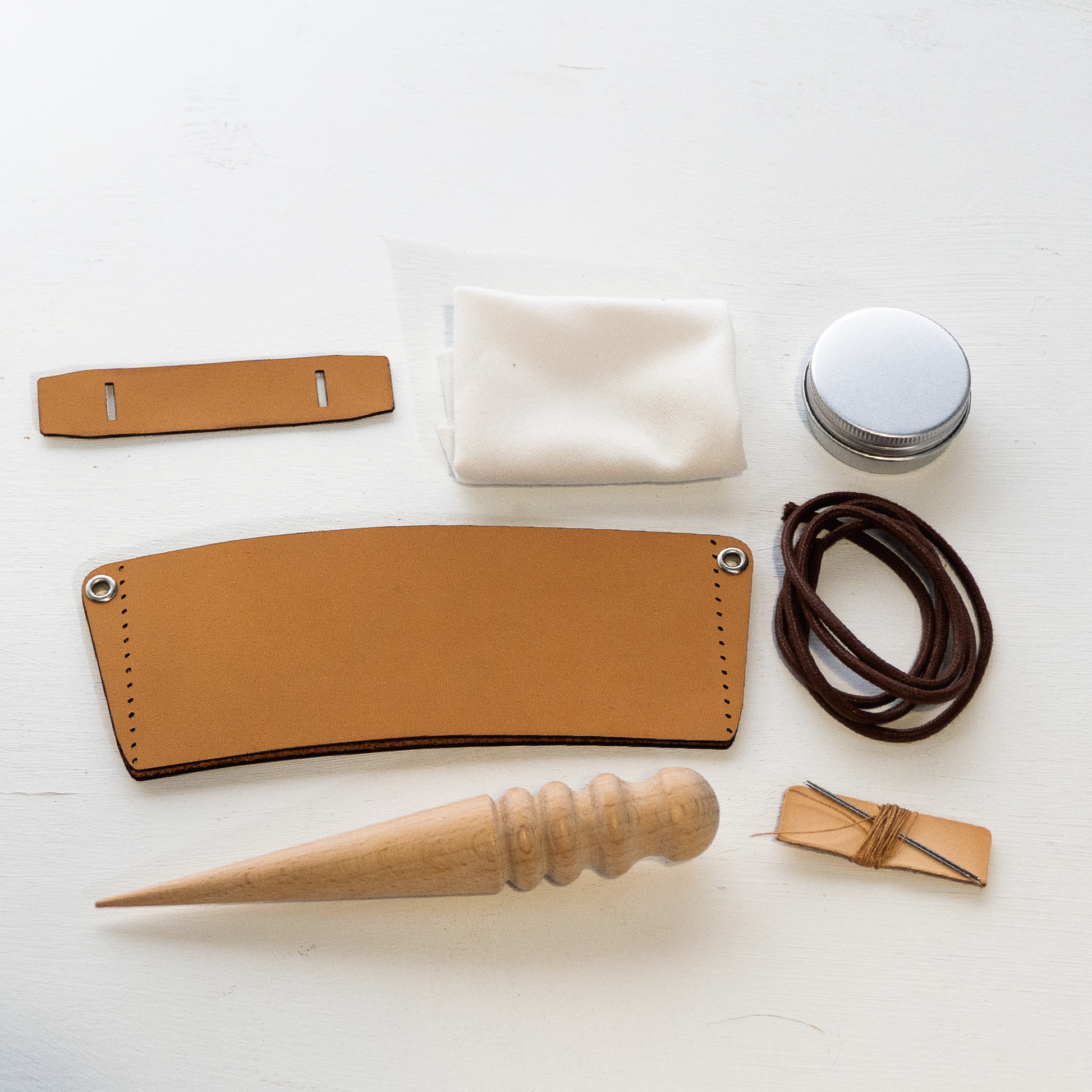 組合皮片 (大塊) - 1 片皮片 (小塊) - 1 片繩子 - 1 條貂油膏 - 1 罐擦拭布 - 1 張針 - 2 根蠟線 - 1 綑磨圓棒 - 1 支教學說明書 - 1 張