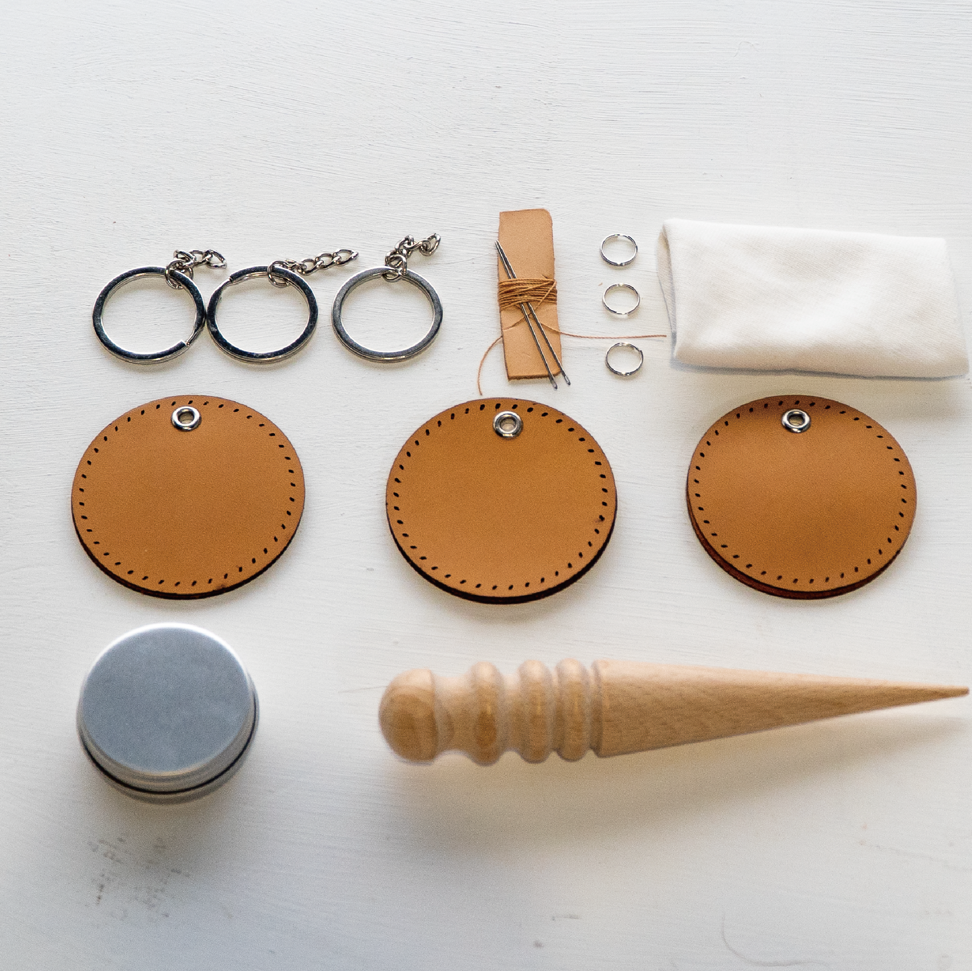 組合皮片 - 3 片鑰匙圈 - 3 個圓形扣環 - 3 個貂油膏 - 1 罐擦拭布 - 1 張針 - 1 根蠟線 - 1 綑磨圓棒 - 1 支教學說明書 - 1 張