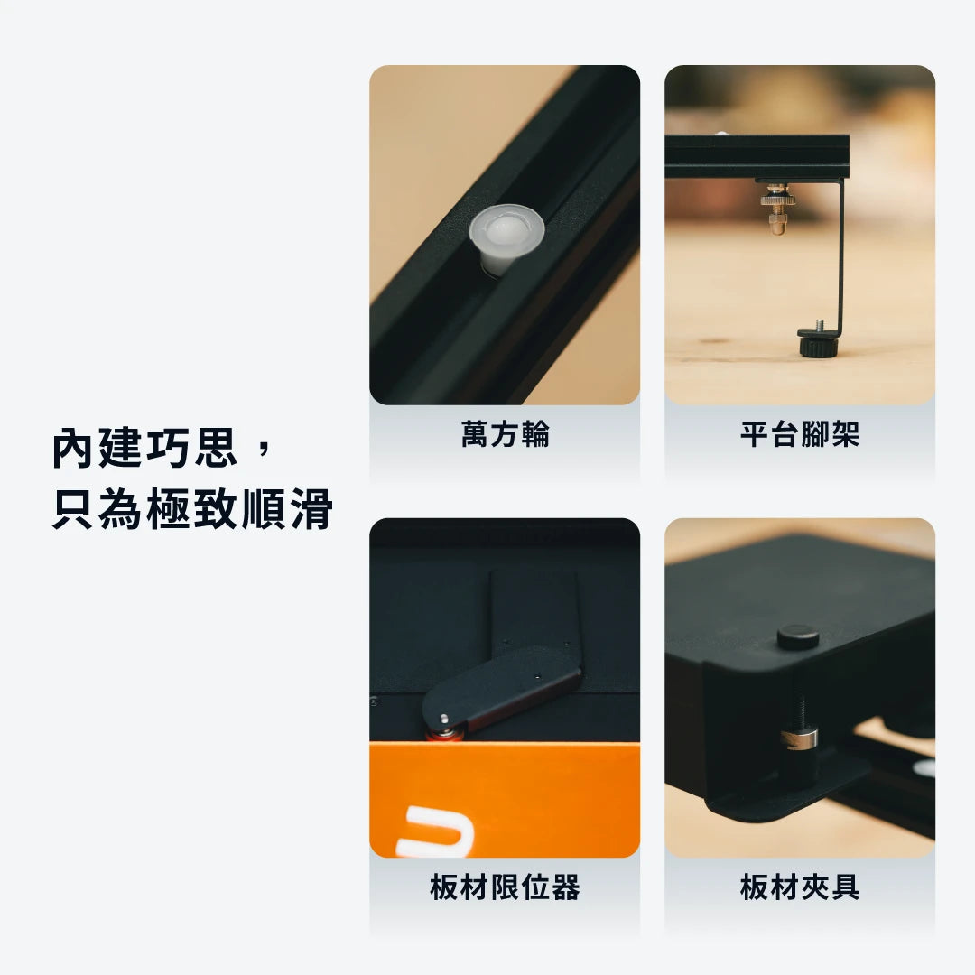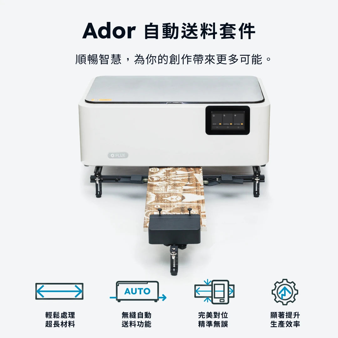 使用 Ador 自動送料套件輕鬆處理長型材料,實現精確對齊和連續生產,全面提升工作效率,減少操作負擔。