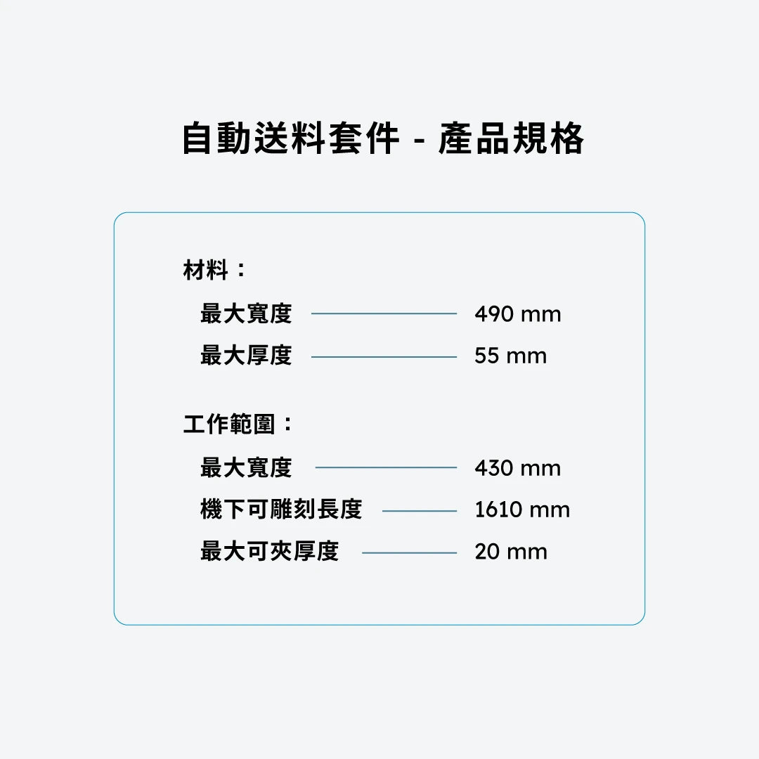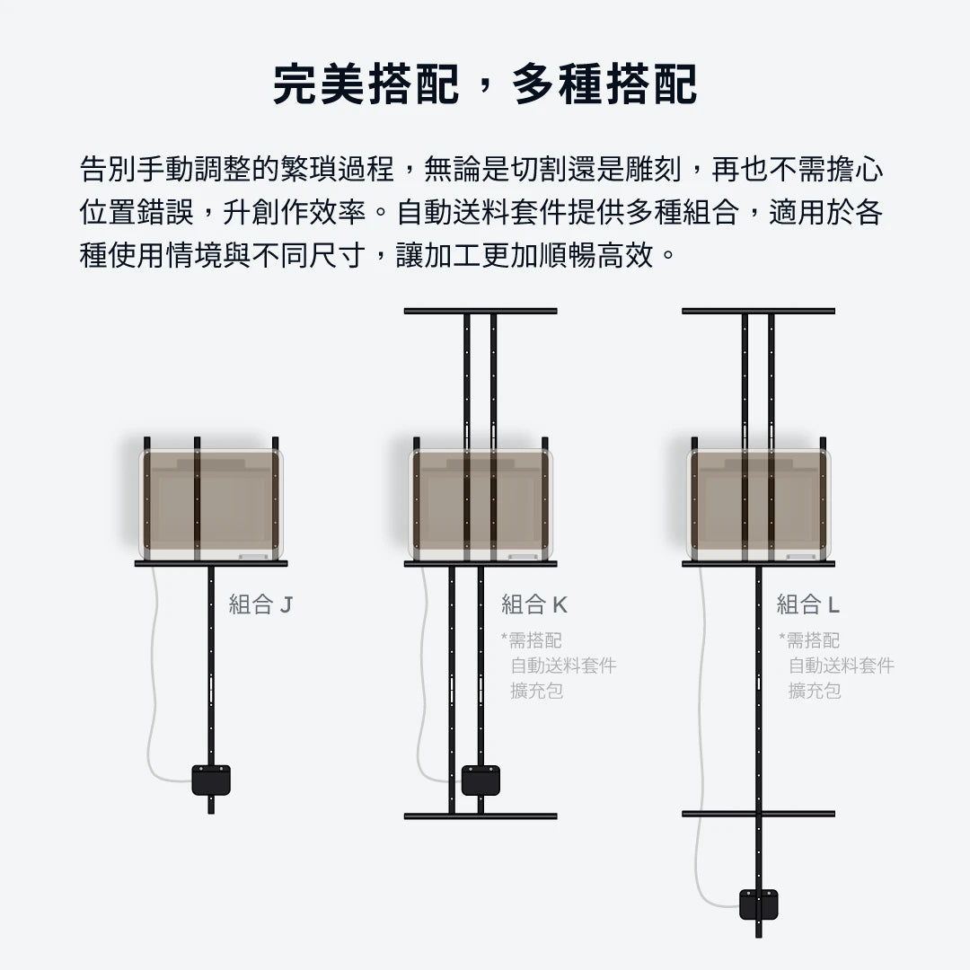 *可額外加購自動送料擴充包,雕刻切割更長板材,詳細可加工長度,請參考下方組裝說明圖。